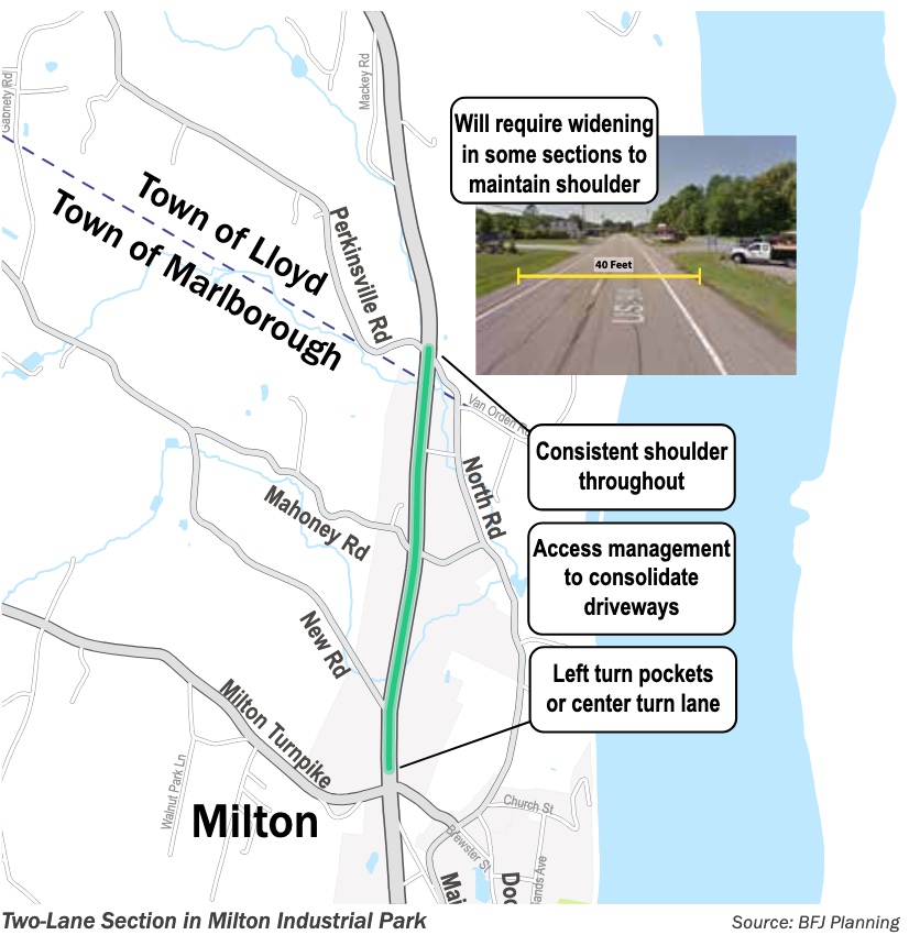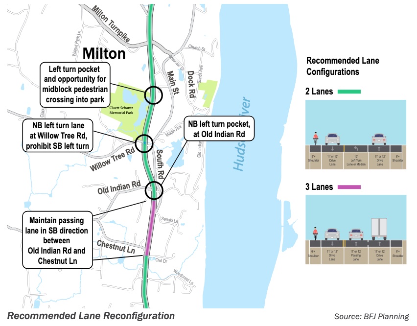 - Lane reconfiguration from four lanes to two lanes with left turning lanes at some of Marlboro and Milton’s most notoriously dangerous sections of 9W: Willow Tree Road intersection, Old Indian Road intersection, and throughout Milton industrial park from Perkinsville Road to Milton Turnpike